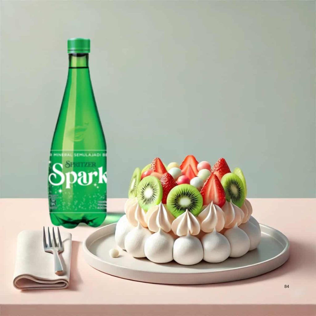 Meringue rangup di luar dan lembut di dalam, dipadankan dengan krim putar dan buah-buahan segar seperti beri dan kiwi. Rasa manis dan sedikit masam dari buah-buahan menjadi lebih menyerlah apabila dinikmati bersama air mineral Spritzer Sparkling. Ia memberikan sensasi segar dan sedikit berkarbonat untuk melengkapkan kemanisan pavlova sebagai juadah raya pencuci mulut yang unik.