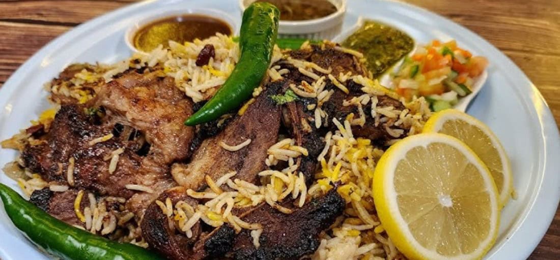 Dimasak dengan rempah Arab yang harum, nasi ini dipadankan dengan kambing perap yang dipanggang hingga empuk dan berjus. Hidangan ini sering dihidangkan dengan acar dan sos pedas bagi menambahkan keseimbangan rasa.